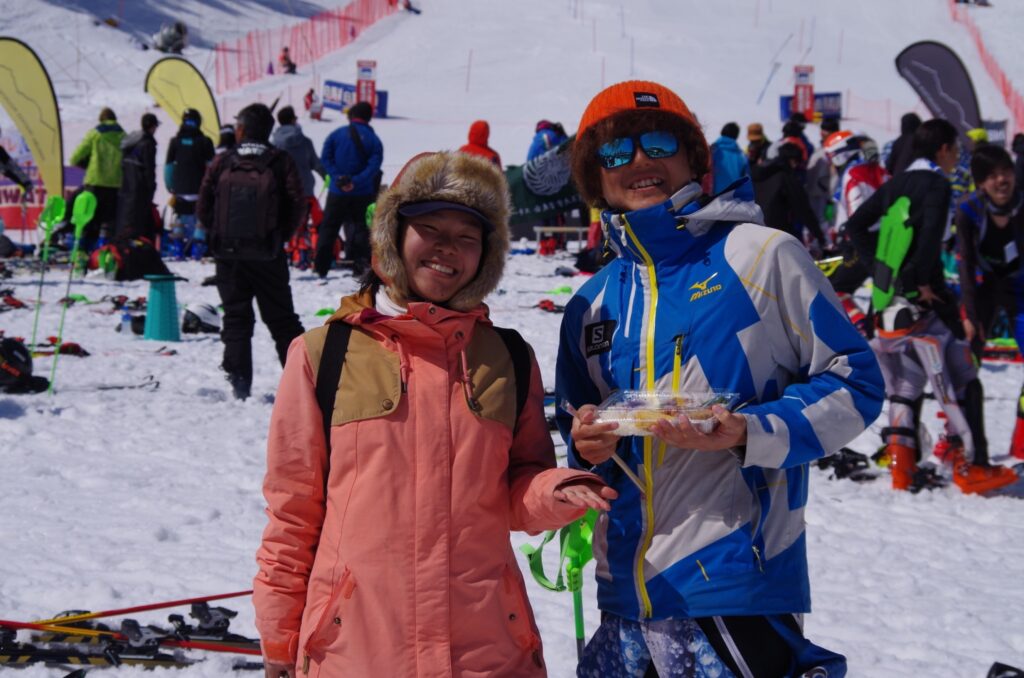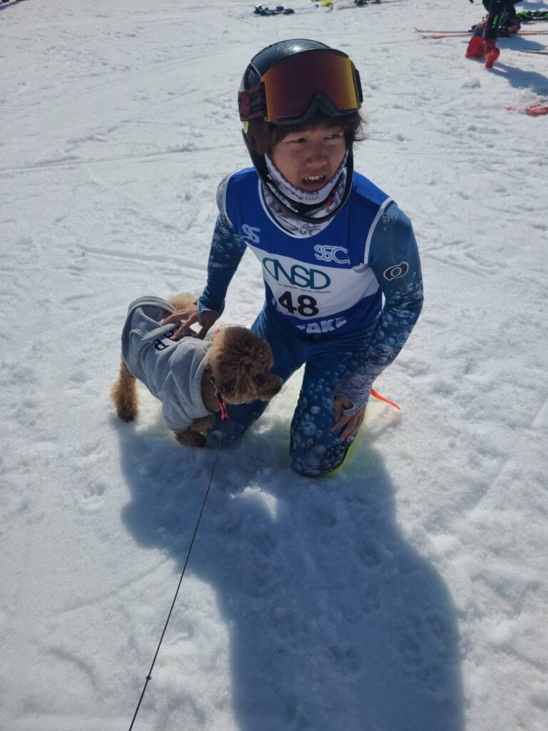 そこからは、とにかく全力でゴールへ。ポールを声でなぎ倒しながら滑り切り、タイム計示を見たときは1位でした。