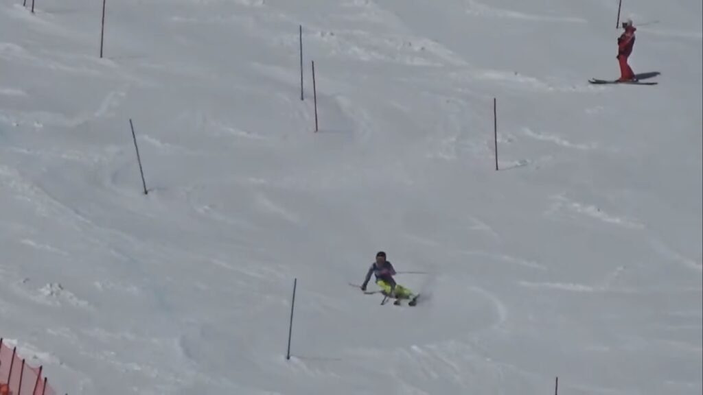 ヘアピン後のギアアップでは、板の反発が上に逃げそうだったので、肩で抑え込むように意識しました。